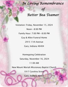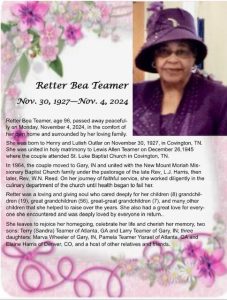 Toya Albertie Ruby Johnson Barry Burks Jr. Retter B. Teamer Tribute Retter B. Teamer Service Info. Eugene Anderson LaVerne Pitts-Taylor Leory E. Davis Lewis McDonald Samuel J. Johnson Johnnie Mae Tyler-Dinkins Karen McCoy Lillian Owens-Sims William Johnson Clifford Gober Elder Jesse Sims Mable L. Carter Marion James Patton Bobbie Jean Dean-Washington Katherine Wyatt Gracile Moore Kenneth Bolling Sr. Marlene Joyce Thomas Back to Obituaries October 2024 December 2024